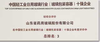 山東藥玻被評為2019年度中國輕工業日用玻璃行業(玻璃包裝容器)十強企業 第3名